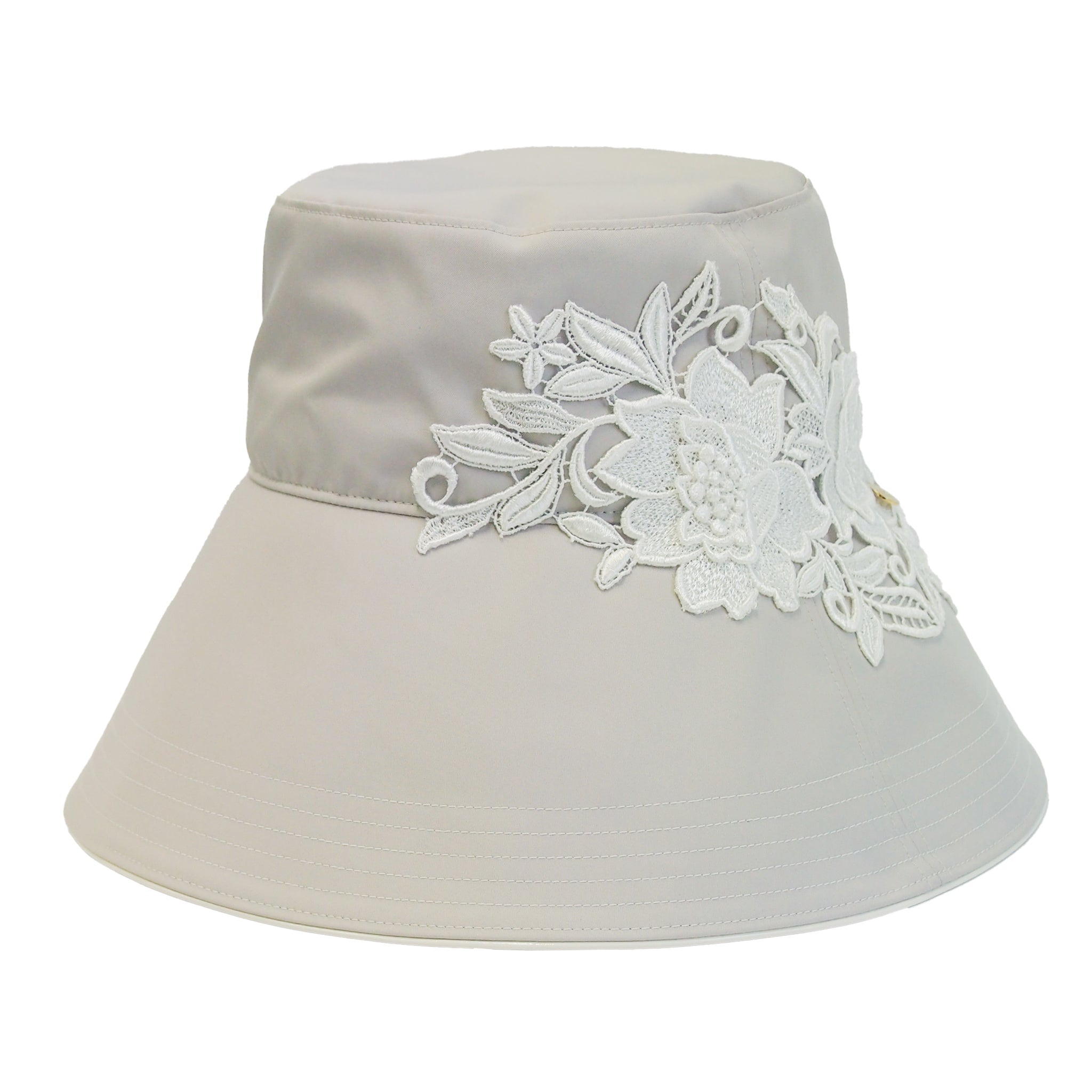 刺繍とロゴチャームが付いたツバ広バケットハットは、上品ながらもエコペット素材を使用しており環境にも配慮しています。